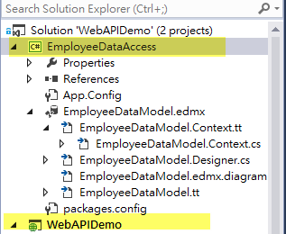 建立完成後solution explorer 會長這樣(一個是for EF 名稱為EmployeeDataAccess,另一個是WEB API)。